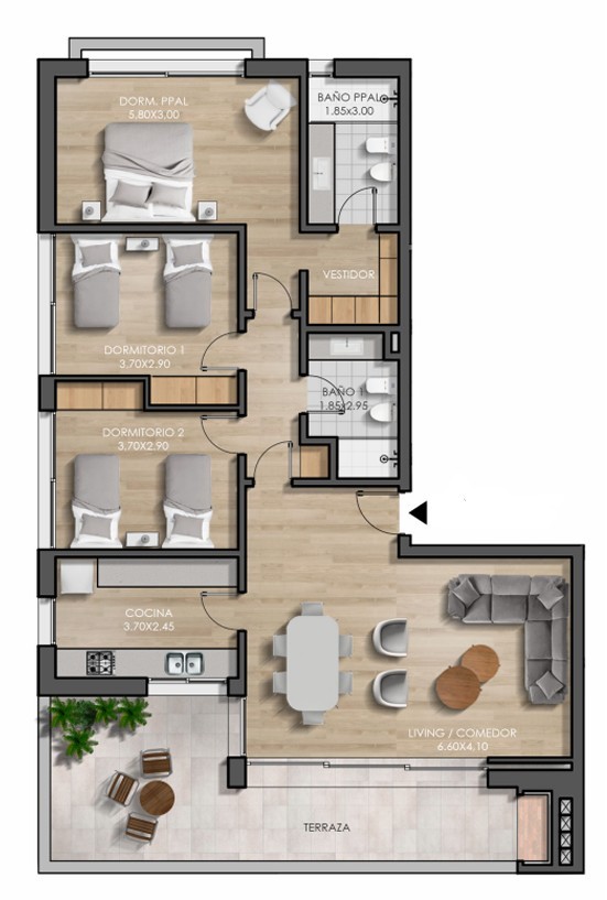 El inmueble cuenta con 3 dormitorios, uno de ellos en suite con vestidor, además de un segundo baño completo. Su amplio living comedor se integra a una cocina definida con ventilación y luz natural y ofrece salida directa a una gran terraza de 23 m² con parrillero privado y vistas abiertas al verde del parque.